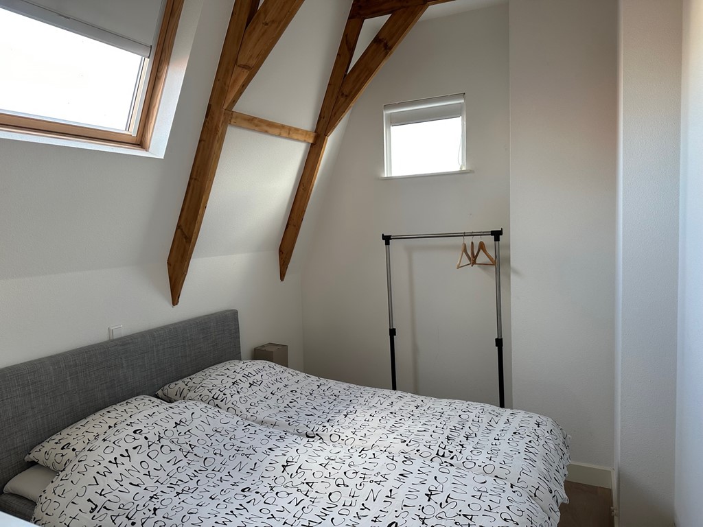 De masterbedroom beschikt over een minstens zo indrukwekkend plafond als de woonkamer en ook vanuit deze kamer kun je naar het balkon.