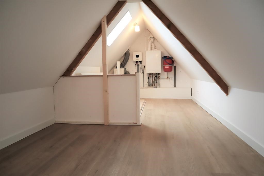 U komt binnen op de begane grond in de grote hal met de trap naar boven, hier is ook de aansluiting voor de wasmachine. Via de trap en overloop komt u op de overloop waar alle ruimtes op uitkomen. De woonkamer aan de voorzijde. Daar is ook een luxe open keuken met inbouwapparatuur: koelkast met vriesvak, combi magnetron, vaatwasser en een elektrische kookplaat met afzuiger. Achter de woonkamer ligt de slaapkamer. De badkamer zit ook op deze etage en heeft een inloopdouche, wastafelmeubel, toilet een handdoekradiator. Via een vaste trap komt u op de (berg) zolder waar ook de cv-ketel en afzuiger hangen. Deze flinke ruimte kan ook gebruikt worden als werk-of slaapruimte. De gehele woning is voorzien van een mooie Pvc-vloer, raambekleding en verlichting. De woning wordt verwarmd d.m.v. vloerverwarming, is goed geïsoleerd en op dak liggen drie zonenpanelen.